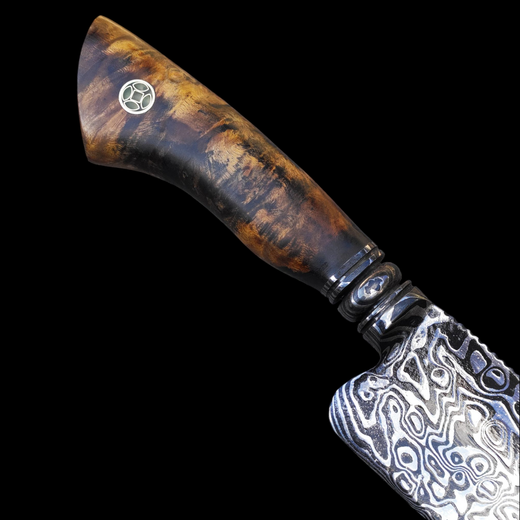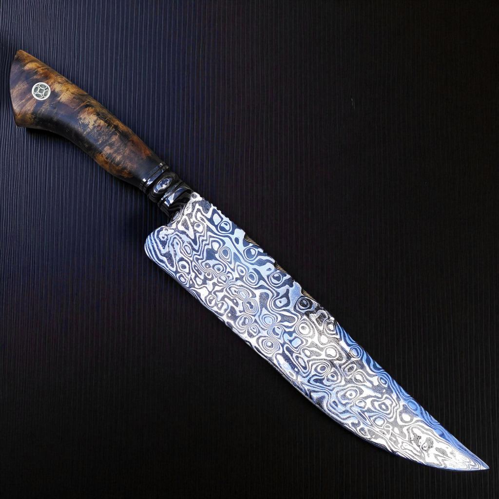 Uma faca artesanal em aço damasco de alto contraste, padrão ALEATORIO, com 11 polegadas de lâmina e 6 mm de dorso robusto.